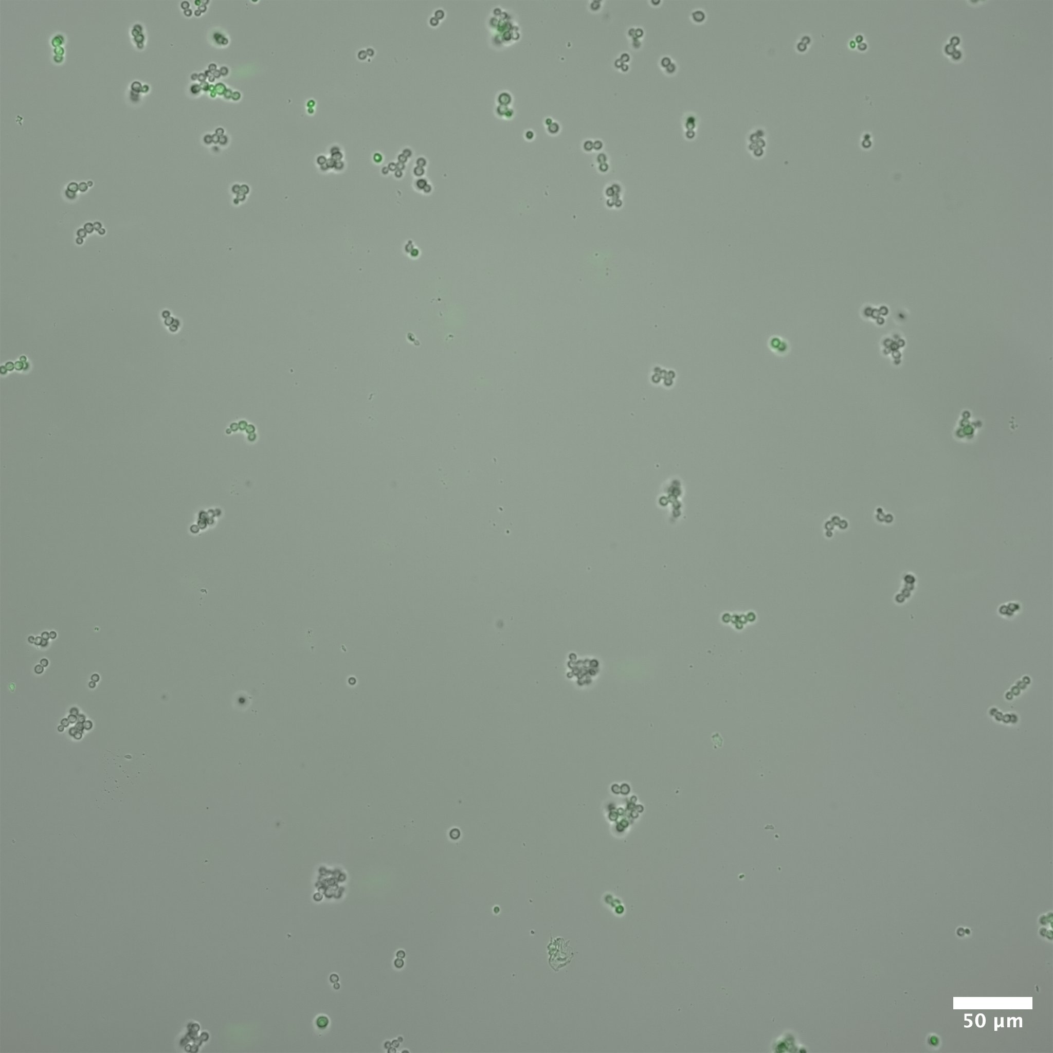 Before adaptation rewired yeast were grown in galactose media. In this condition we expect that the gal promoter will be activated, expressing both GFP and HIS3. In this case, we expect that the cells will glow brightly green when excited with blue light. Figure 3 shows rewired cells pre and post adaptation. Expression from the Gal promoter (as visualized by GFP expression) is very strong prior to the switch to glucose. After adaptation, expression is much less (but not completely absent). At the same exposure (0.5 seconds) it is difficult to see the fluorescent signal, but at longer exposure some fluorescence is visible.